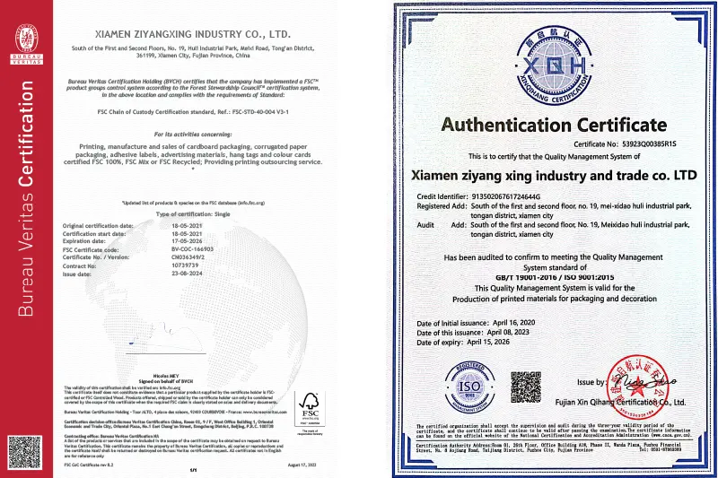 A: mayroon kaming FSC, FDA, SGS, VOC, at pagsunod sa mga regulasyong pangkapaligiran gaya ng RoHS, 94/62/EC, at US TPCH. Ang aming pabrika ay may ISO9001 certification, bilang isang nangungunang internasyonal na packaging supplier at exporter.